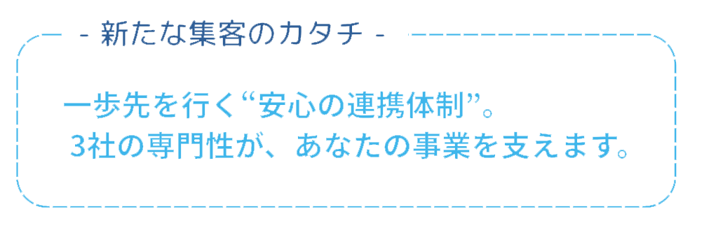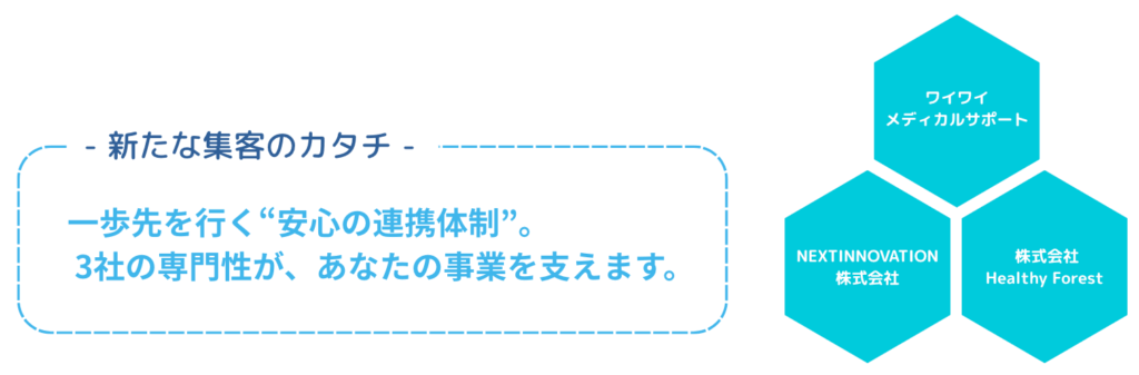 診療・処方・集客・サポートを一貫して提供し、患者様には安心の医療体制を、 連携店様にはビジネス拡大のチャンスを生み出します。 三社の力を活かした“一歩先を行く医療連携”をぜひご活用ください。