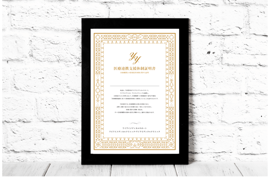 医療連携の証として「支援体制証明書(ディプロマ)」を発行し、バナーや掲示物と併せて店舗の安心感を視覚的に伝えます。制度のある店舗として、お客様にもわかりやすく案内できます。