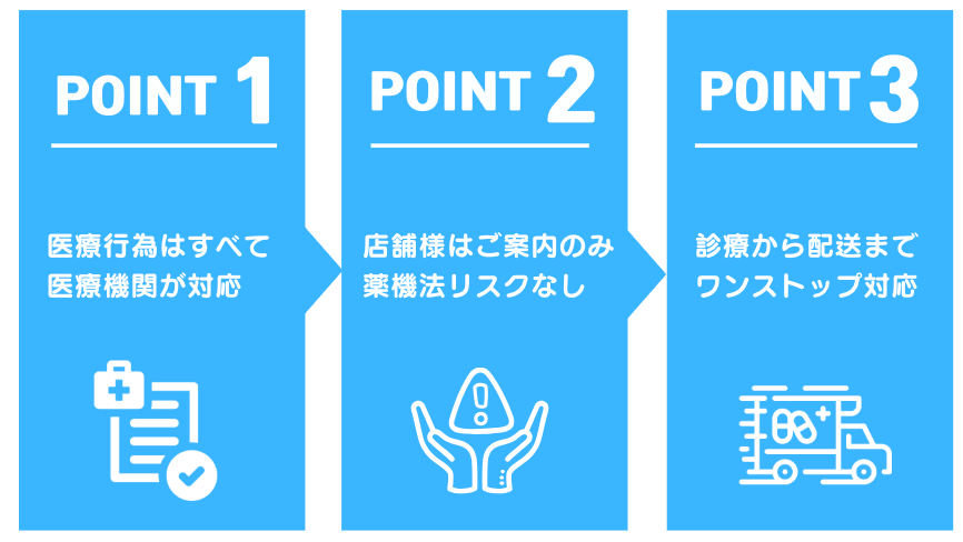診療・処方はすべて医師がオンラインで対応するため、店舗様が医療行為を行う必要はありません。