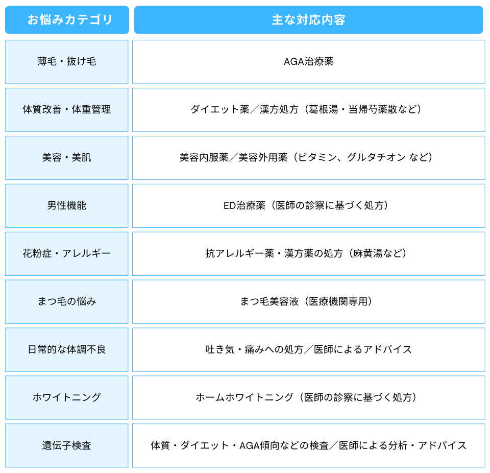 対応可能なお悩み一覧(オンライン診療で処方・発送まで完結)