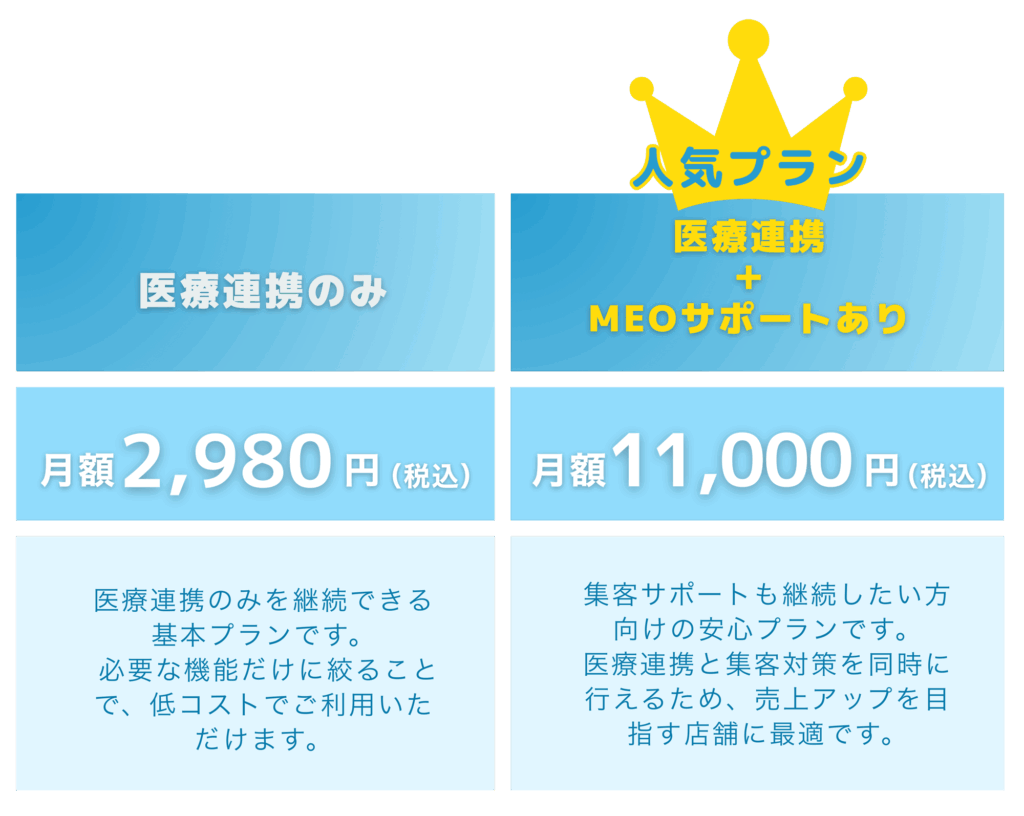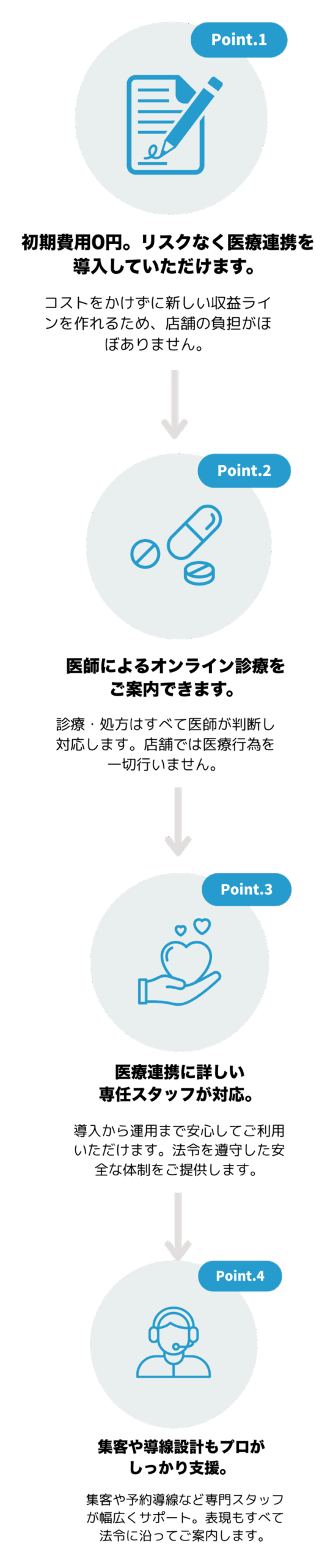 診療・処方はすべて医師がオンラインで対応するため、店舗様が医療行為を行う必要はありません。 また、MEO対策についても医療表現のルールに沿った安全な情報発信をサポートするため、初めての店舗様でも安心して導入いただけます。